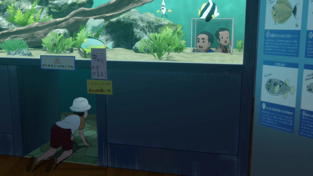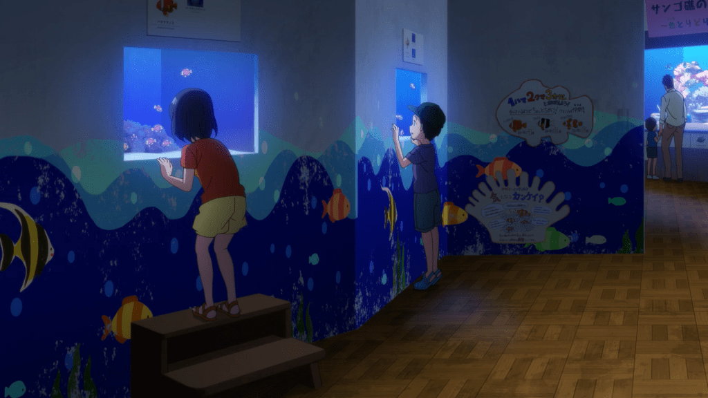 Let’s take a moment to appreciation the immaculate directing and compositions throughout the show. The excellent use of color, character placement, and the scenery of Okinawa really blend well to create dynamic and interesting scenes even if it’s just Fuuka (Top images) making her way through the city or Kukuru (Bottom images) going about her daily life. It’s not just the scenes but the characters as well with their subtle moments such as Fuuka’s hesitant walking or Kukuru’s familiarity of her home and determination to save the beloved aquarium. Even with no dialogue and it’s easy to pick out and that (in my opinion) is what makes a great anime.