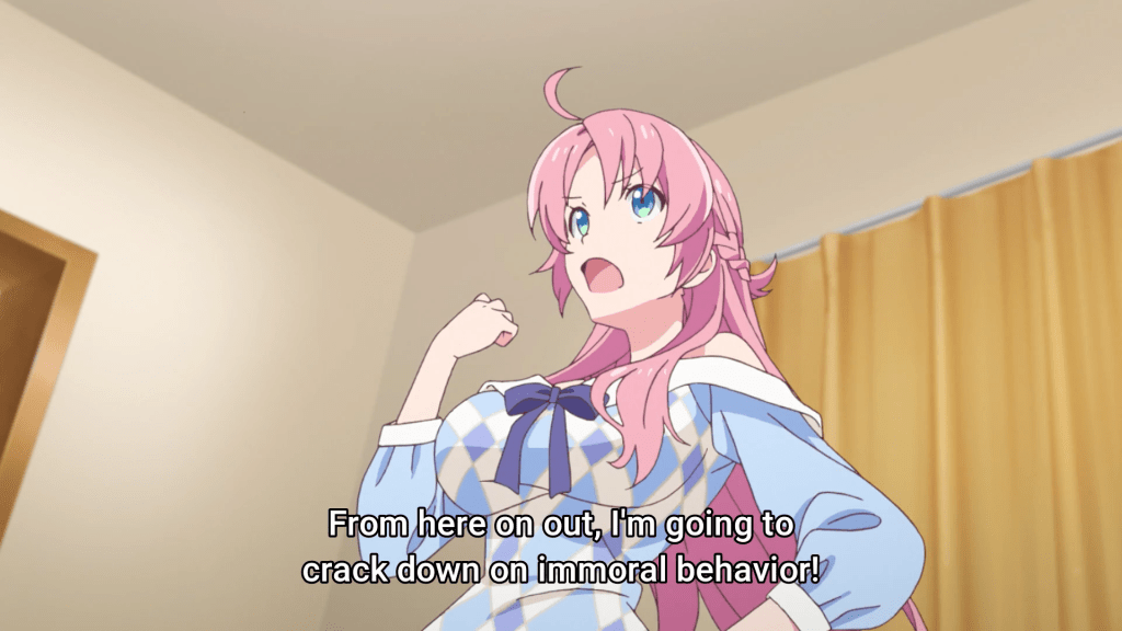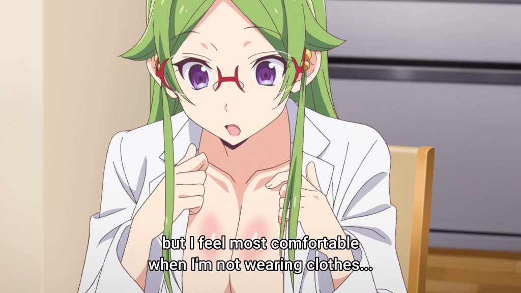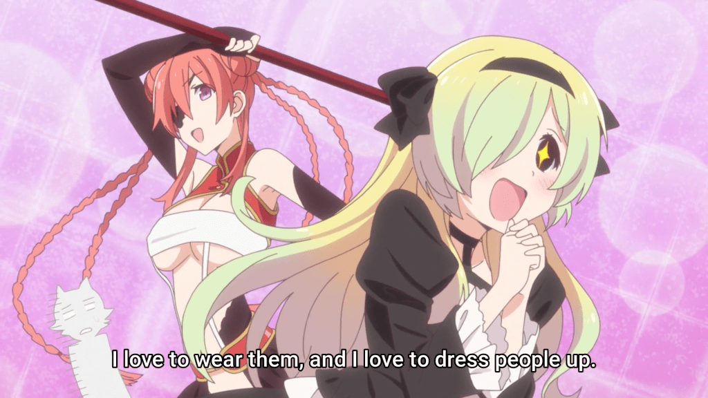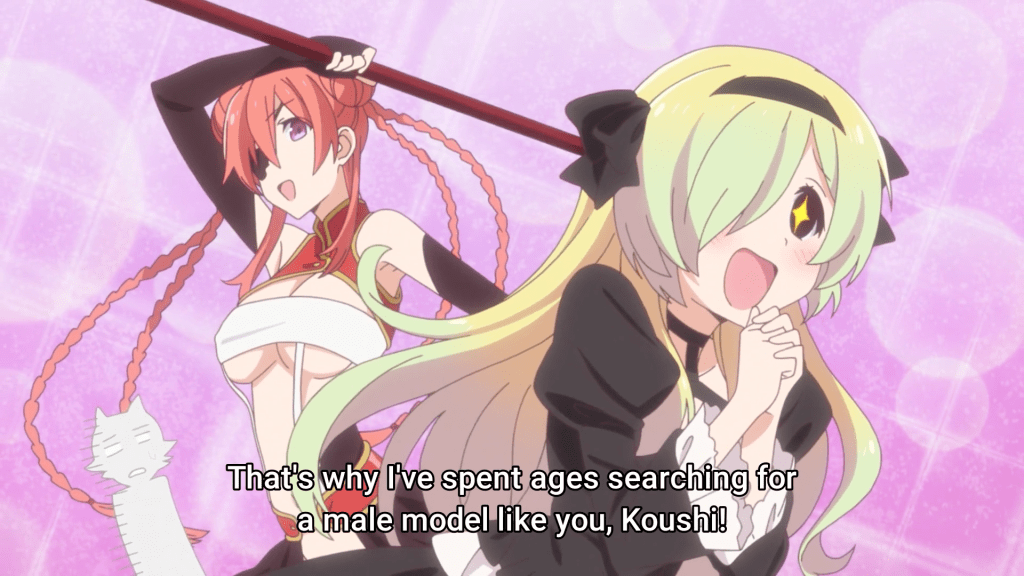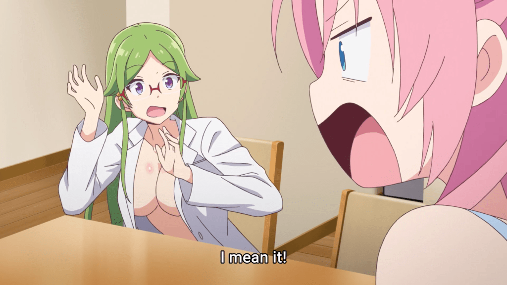 If I had to define a word or phrase to describe the aesthetic of the show it would simply be “ONE HOT MESS”. First off, the character designs are phenomenal! I actually prefer these over the manga, which surprised even me! The MESS part comes with the chaos that inevitable happens in the show but I don’t mean that in a bad way. The character are such natural disasters on their own that it’s hard to predict what will happen next! You have crazy biochemical researchers, obsessive cosplayer, and girl with androphobia (the fear of men) that always ends up passed out with a nose bleed! And that’s just the tip of the iceburg as we’ve only gotten to know three out of the six heroines!