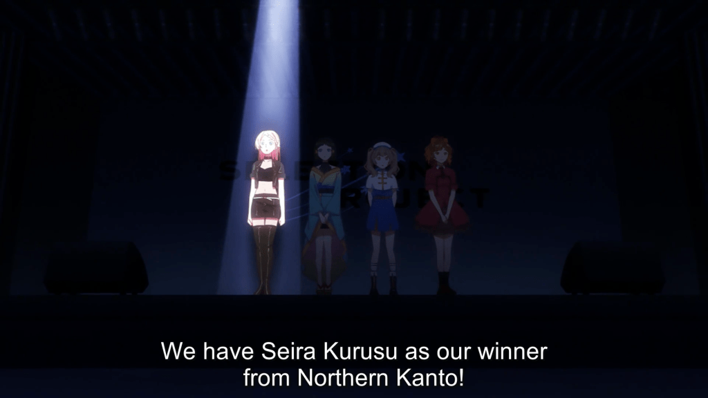 Throughout we do get a small introduction a minimal lines from the other regional winners but other than that, Suzune backstory, and a song by a past contestant…there really wasn’t a lot going on. The biggest moment in the episode was the ending, what do you mean Suzune didn’t win her region?! Isn’t she the main character!? How will the story go forward?! Guess I’ll have to watch the next episode!