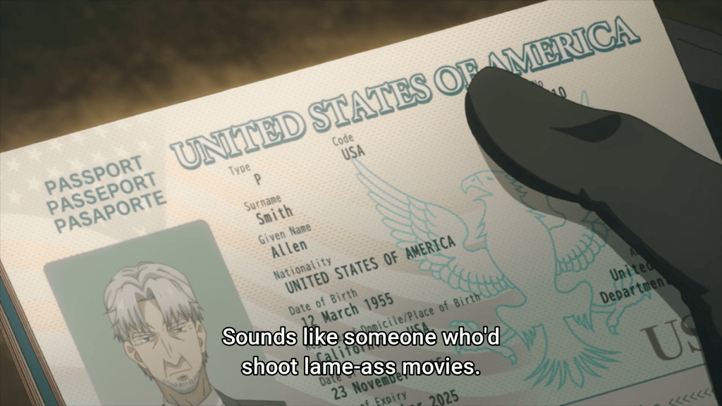 I laughed out loud at this scene, I mean…Allen Smith DOES sound like someone who’d shoot “lame-ass” movies lol. This scene is really funny out of context but I digress. There seems to be a lot of information and character development being thrown around but not really sure where this is headed, other than simply showing off Lugh’s experience in the assassination world.