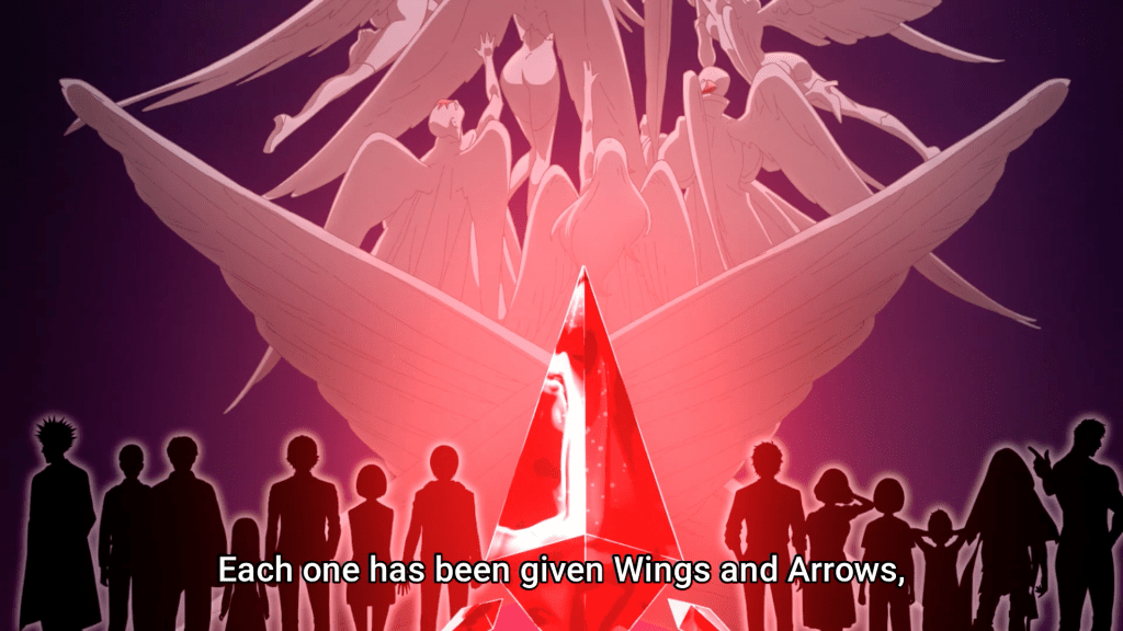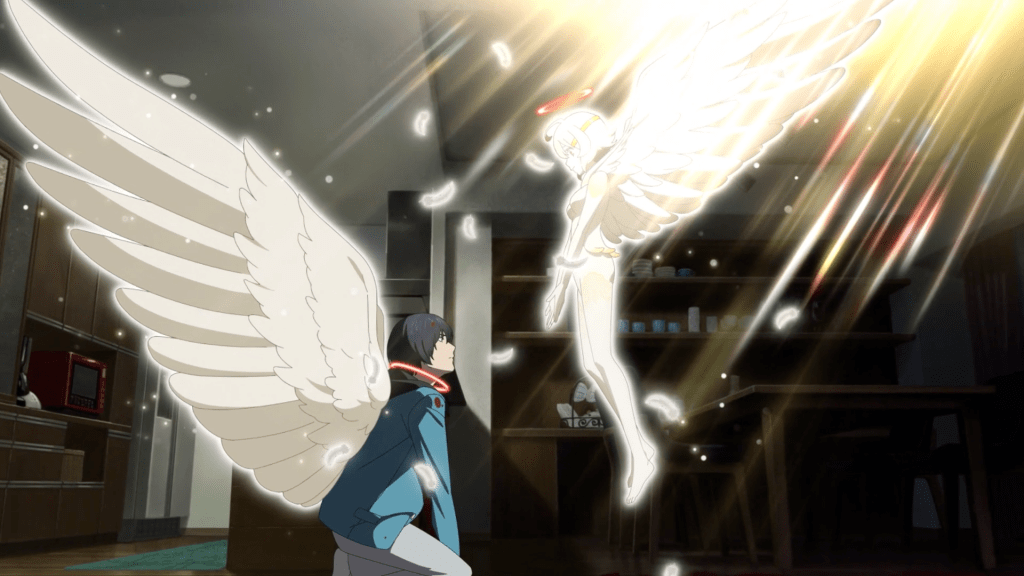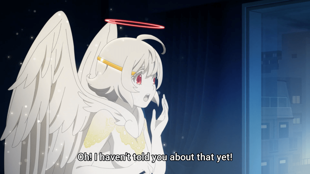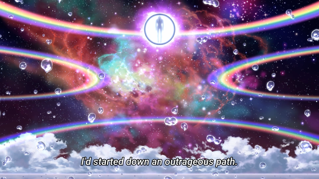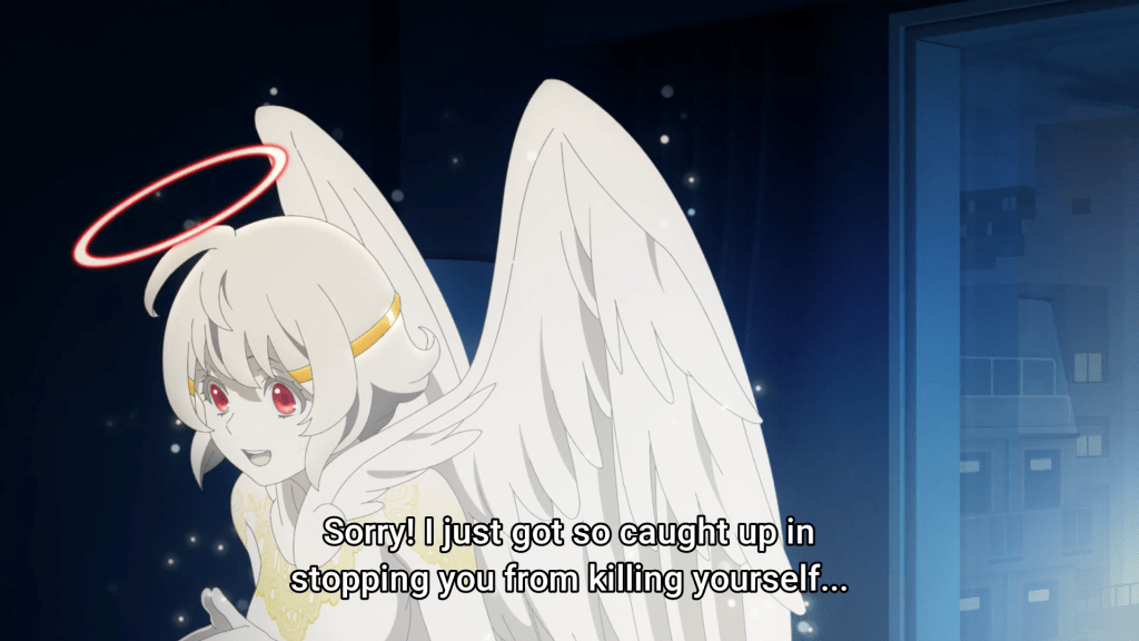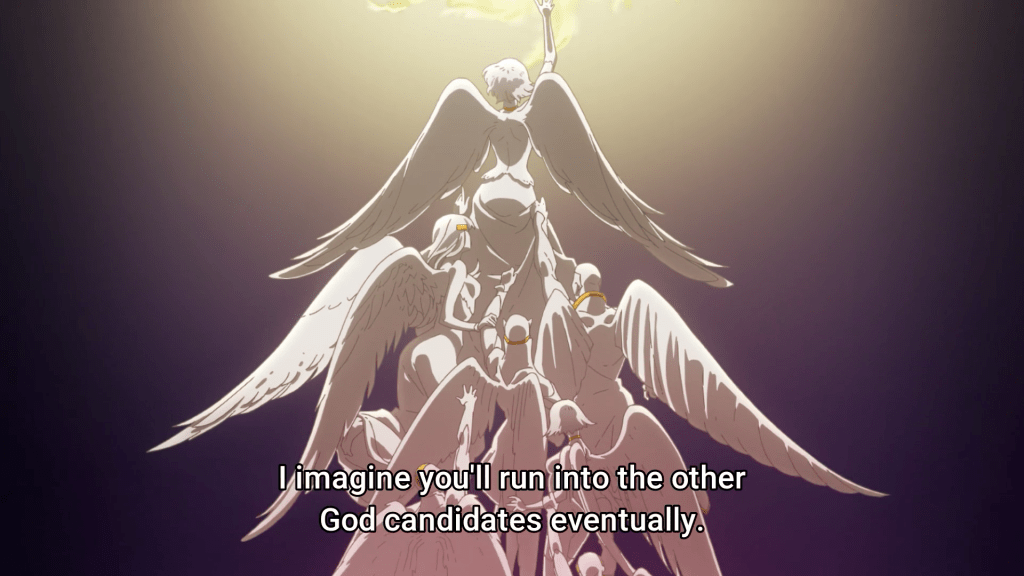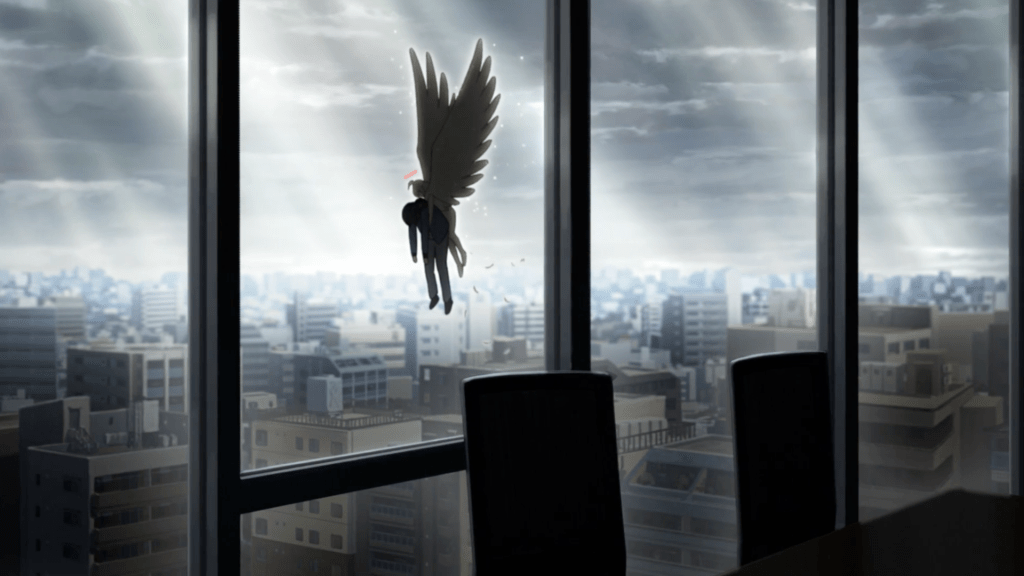 First off, the overall composition of the show is phenomenal. Mirai being saved by his guardian angel, quite literally, was an impactful scene but that split second where the view changes from their immediate position to the view from the random office where you can make out the outline of Mirai and Nasse was an eerie transition that foreshadows a not-so-happy future for the duo (at least for Mirai). There’s a lot of symbolism throughout the show, more specifically the idea of an omnipresence, displayed by the rays of light. The death game that Mirai is pulled into has an end goal of creating a new God, what entails with the new title, no one quite knows but I guess we’ll figure it out as we go!