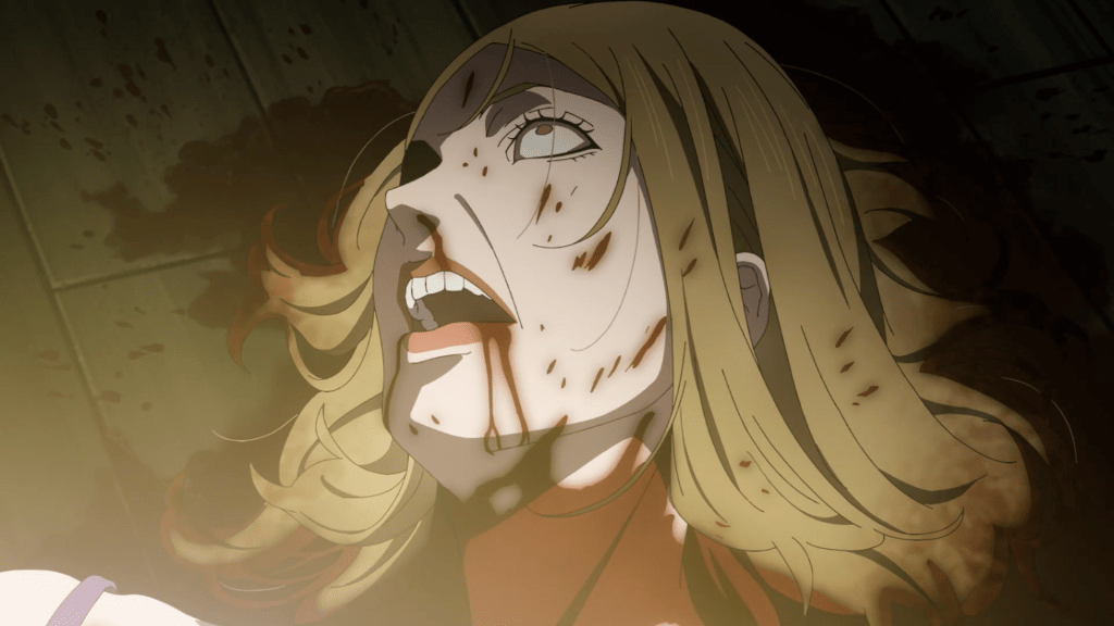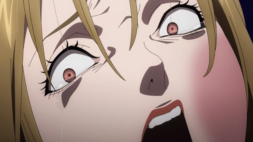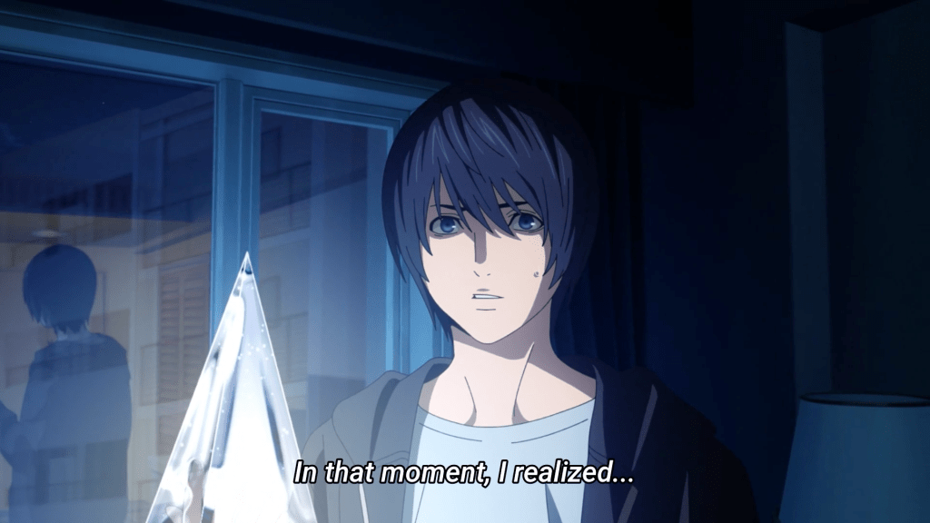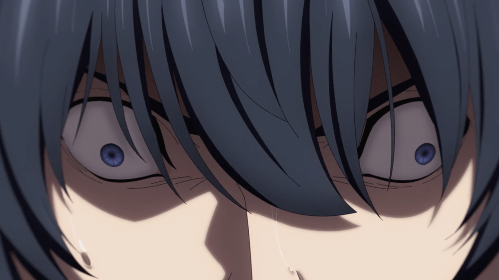 Different story, but the same crazy eyes! I missed these mind breaking moments when the characters realize the consequences of their actions and their pupils shrink to emphasize fear and despair. The distorted facial images and the way the eyes roll back are ominous and help reinforce the dark story that unfolds before our eyes. Death Note had a similar aesthetic along with a strong use of monochrome with accent of colors to emphasize movement and severity of an action (Light’s first killing spree for example which was essentially just him writing in a notebook and eating chips) which I’m hoping to see again here with Platinum End.