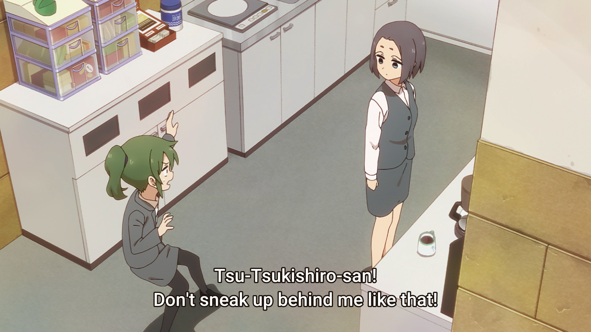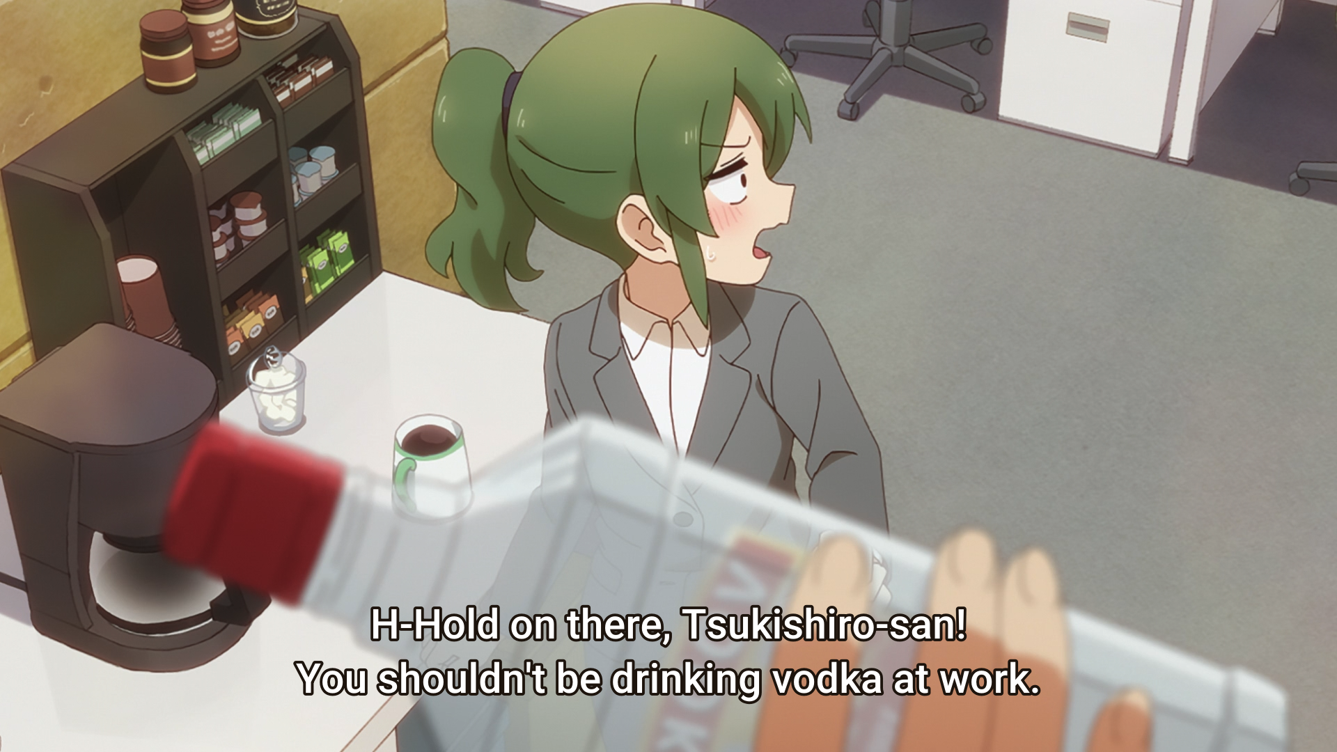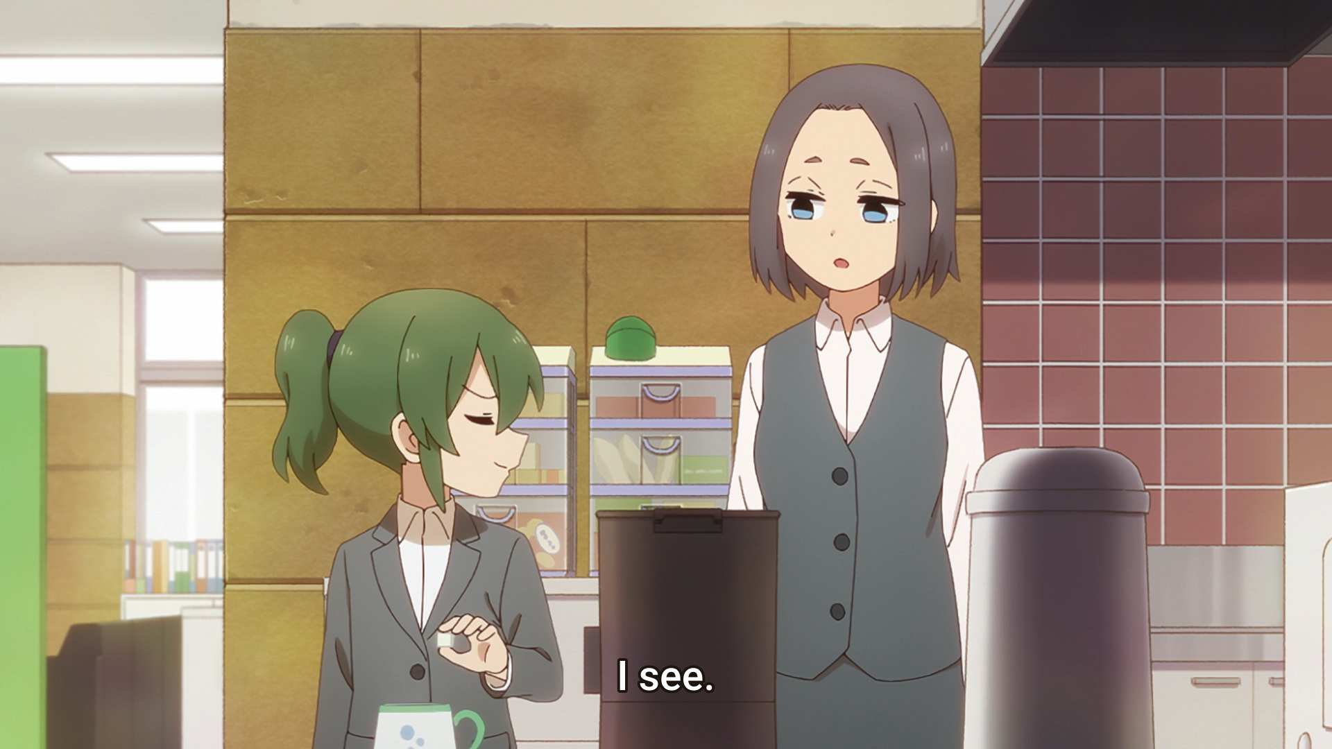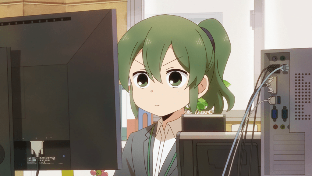 The attention to detail throughout the show is staggering! every scene has so much life beyond the main characters. Igarashi’s kitchen is clean and organized, and I love the little details that are on her bowls and cups! The atmosphere of the train ride to the office is quite lively as it’s packed full of people and there’s an emphasis and scale to Igarashi’s height as she struggles to reach the handles. As she’s working in the office, it’s clear to see that she’s using a DVI port to connect her tower to her computer and to be honest, I’d never thought I would be able to tell which type of connection a monitor is using in an anime! And last, but not least, the vending machine scene, once again bringing a scale to Igarashi’s height but also her demeanor in how she holds herself. In this particular scene, she’s slouched with her head down since right before this she realized that she had made a huge mistake on one of the tasks that were assigned to her. The body language is clear and distinguishable, what’s also clear and distinguishable are the different drinks in the vending machine! Usually, the vending machines only have cans or bottles but the selection here is quite nice!