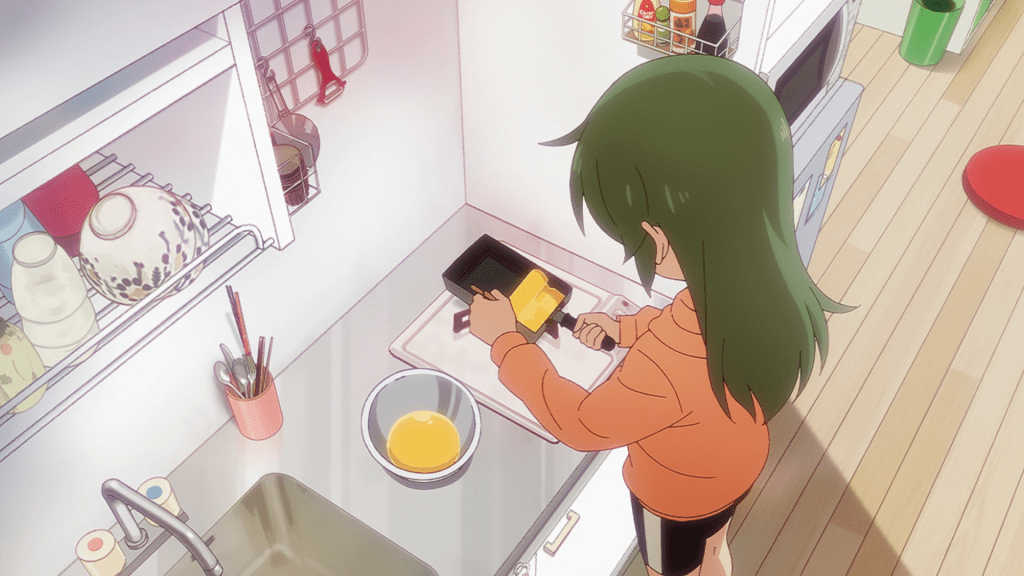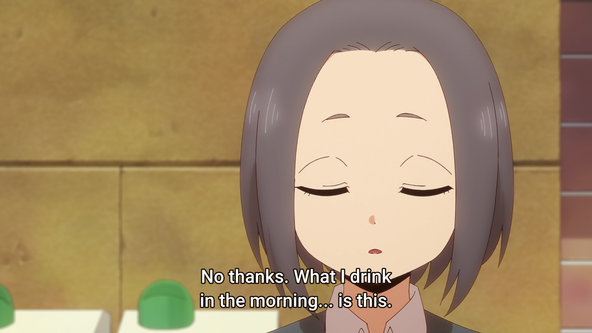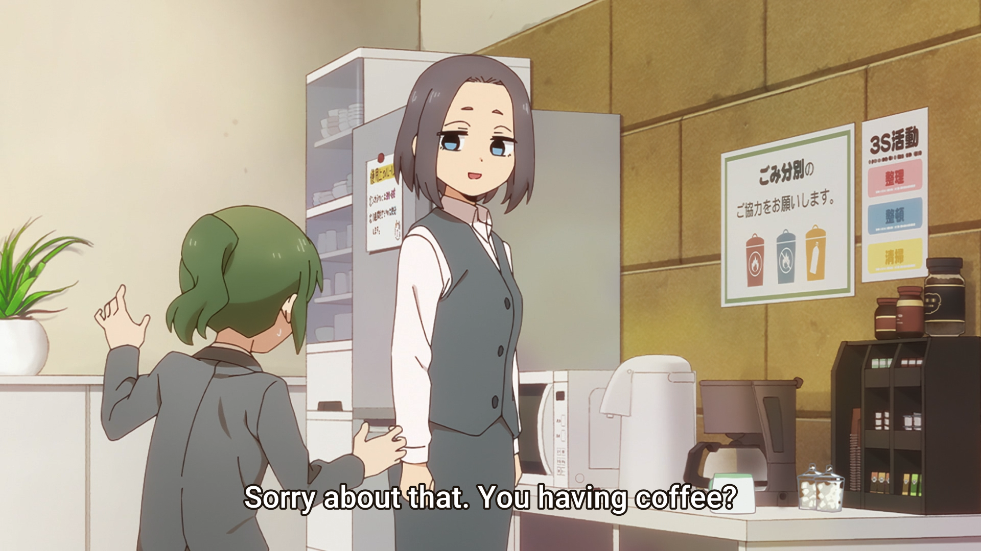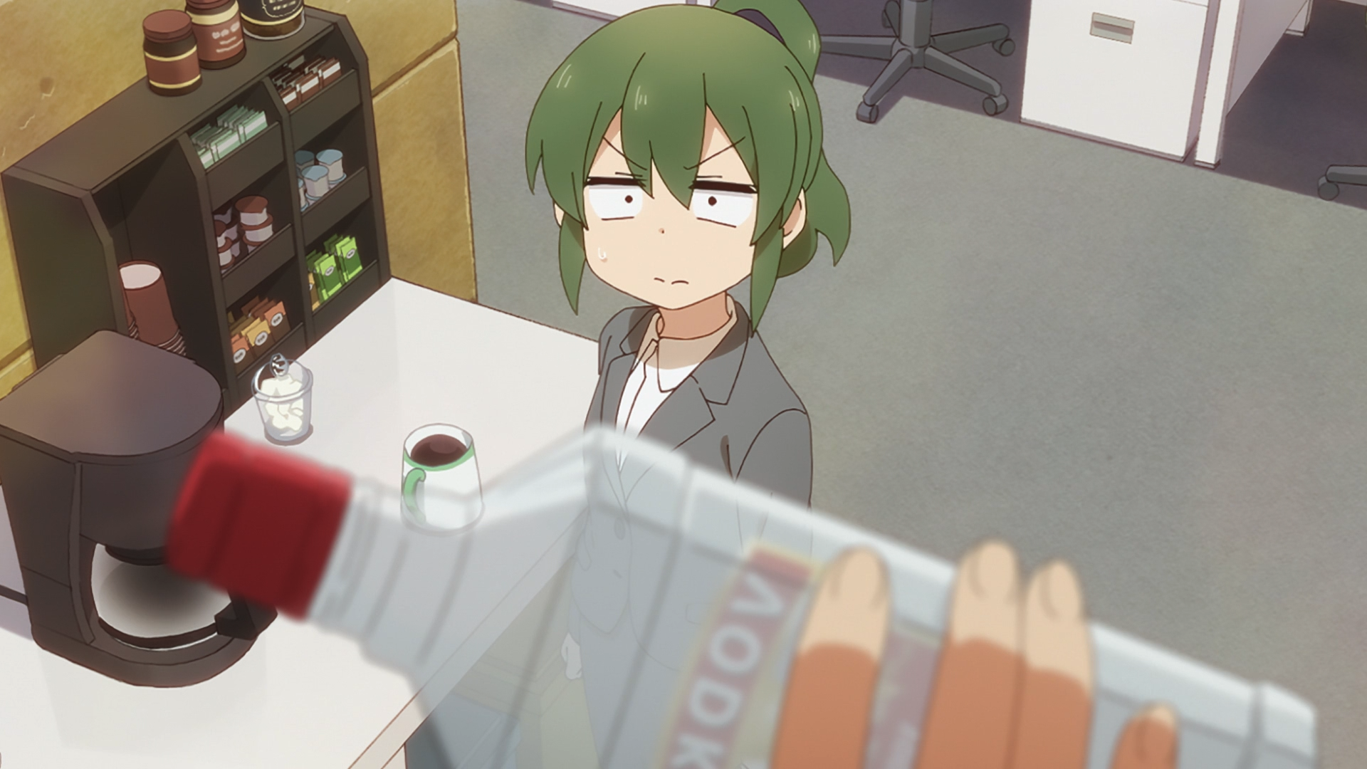 The attention to detail throughout the show is staggering! every scene has so much life beyond the main characters. Igarashi’s kitchen is clean and organized, and I love the little details that are on her bowls and cups! The atmosphere of the train ride to the office is quite lively as it’s packed full of people and there’s an emphasis and scale to Igarashi’s height as she struggles to reach the handles. As she’s working in the office, it’s clear to see that she’s using a DVI port to connect her tower to her computer and to be honest, I’d never thought I would be able to tell which type of connection a monitor is using in an anime! And last, but not least, the vending machine scene, once again bringing a scale to Igarashi’s height but also her demeanor in how she holds herself. In this particular scene, she’s slouched with her head down since right before this she realized that she had made a huge mistake on one of the tasks that were assigned to her. The body language is clear and distinguishable, what’s also clear and distinguishable are the different drinks in the vending machine! Usually, the vending machines only have cans or bottles but the selection here is quite nice!